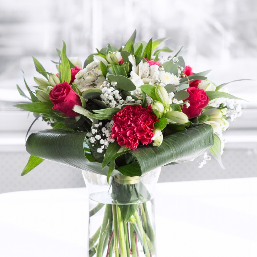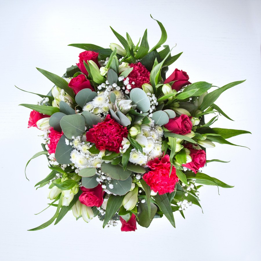 Celebrate special moments with our sophisticated bouquet, featuring sweet white chrysanthemums and gypsophila paired with luxurious red roses and carnations. Enhanced by white alstroemeria and lush aspidistra leaves, this arrangement exudes timeless elegance.