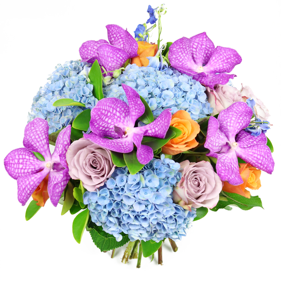 Bring the brightness and warmth of a sunny day into their home and heart! Fiery orange and blue blooms are gathered together, capturing the carefree spirit of a summer evening.